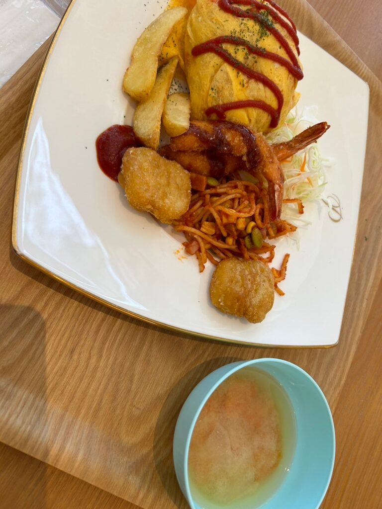 子どもたちの大好きなオムライス・ポテト・エビフライ・チキンナゲット・ナポリタンが入ってて、ボリュームもあってとても豪華メニューでした!!