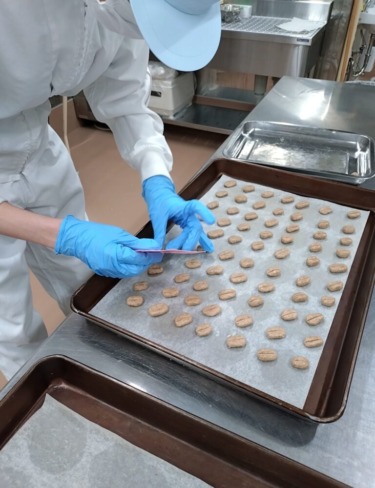 ひとつひとつグラムを測り手作業で形を作って、コーヒー豆に見立てて筋を入れて焼いています。