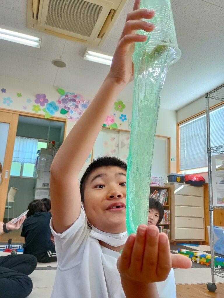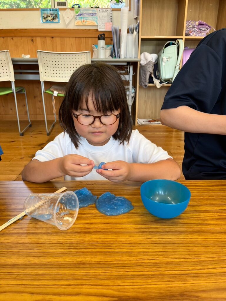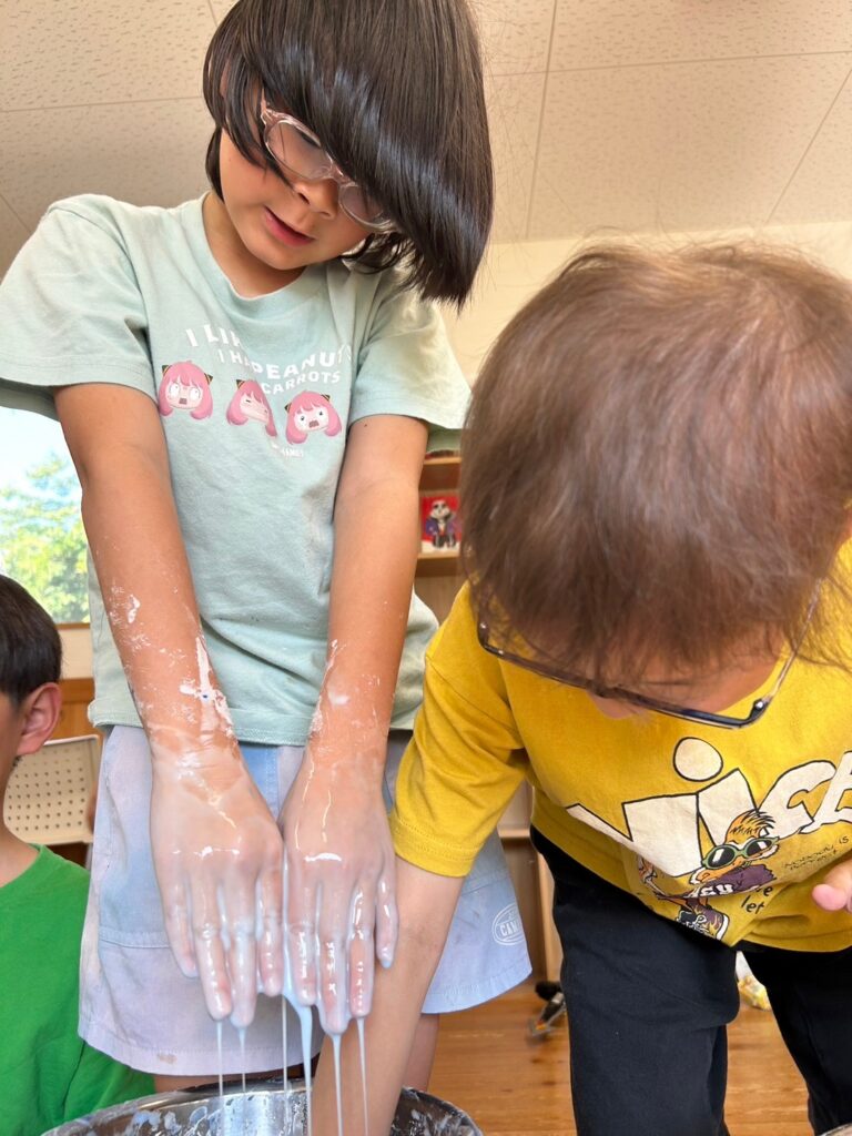 水を混ぜた片栗粉を混ぜて硬くなったり溶けだしたりと感触を楽しんでました。
