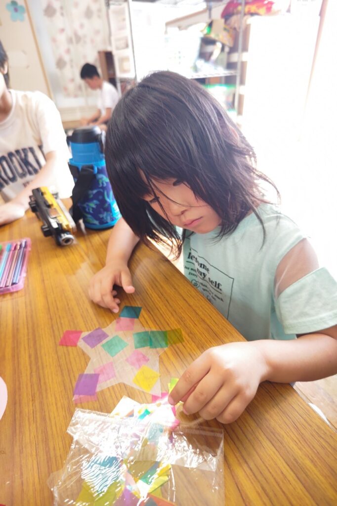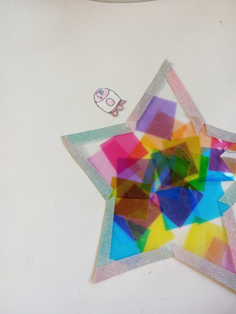 色々な色のセロハンを星形にぺたぺたと貼っています。